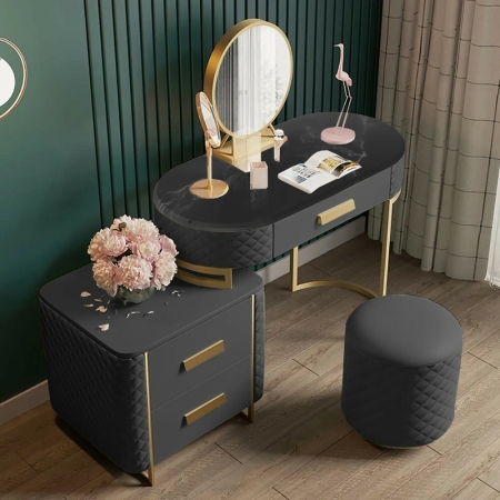 Moderner Stil: Mit seiner modernen Silhouette bringt dieser geschmackvolle Frisiertisch oder Konsolentisch ein Element von Glamour und Funktionalität in Ihr Schlafzimmer oder Wohnzimmer. Konstruiert aus Metall, Kunstmarmor, Massivholz und Kunstleder oder Samt, dauerhafte Nutzung und ein komfortables Erlebnis für die nächsten Jahre.