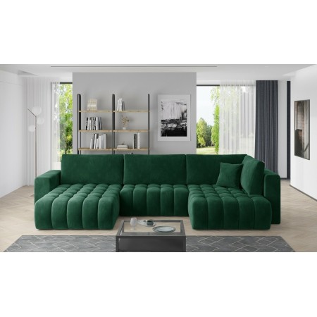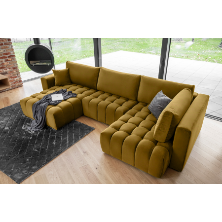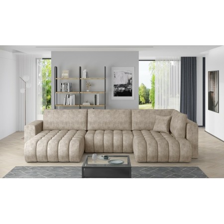Bonito to wyjątkowy narożnik pokaźnych gabarytów, który z jednej strony spełnia funkcję głównego elementu wyposażenia twojego wnętrza i zarazem serca salonu, a z drugiej jest on wysoce funkcjonalnym meblem wyposażonym w funkcję spania. Przemienienie wygodnego narożnika w bardzo duże i wygodne łóżko z obszernym pojemnikiem na pościel, przebiega prosto i intuicyjnie, gdyż odbywa się za pomocą mechanizmu DL.